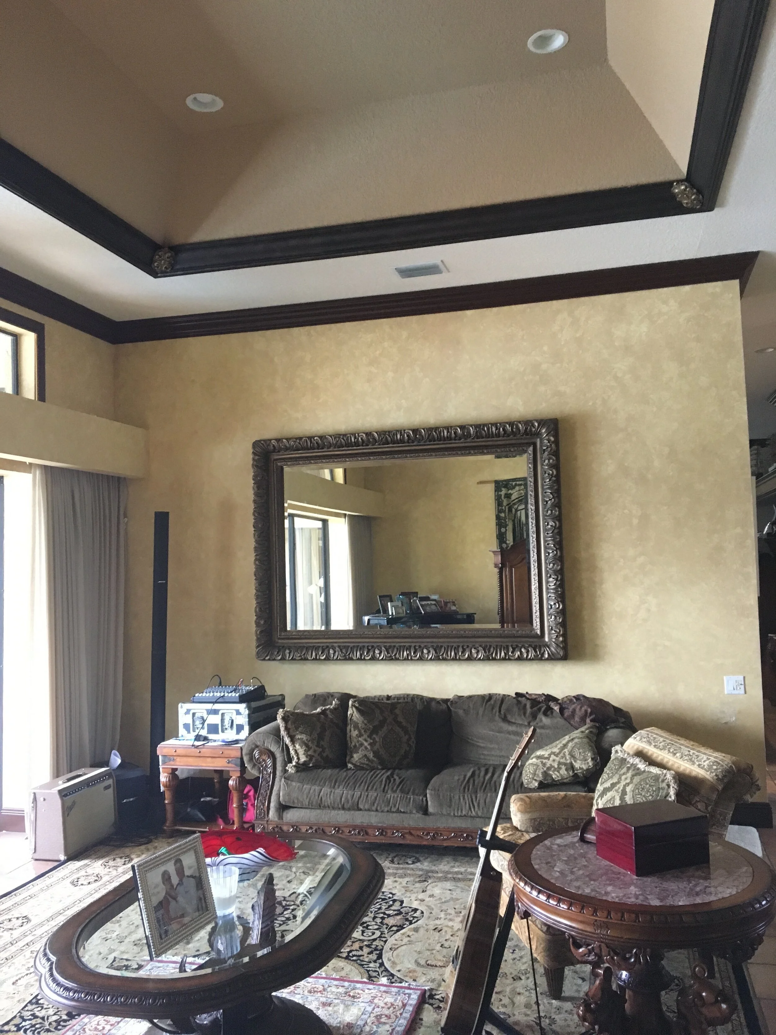 One of the standout architectural features in this room is the remodeled tray ceiling, painted in a rich Aqua accent color and framed with newly added two-piece crown molding. The ceiling now boasts a modern nickel/silver linen wallpaper, with a custom medallion highlighting a grand Mediterranean wrought iron chandelier at the center.