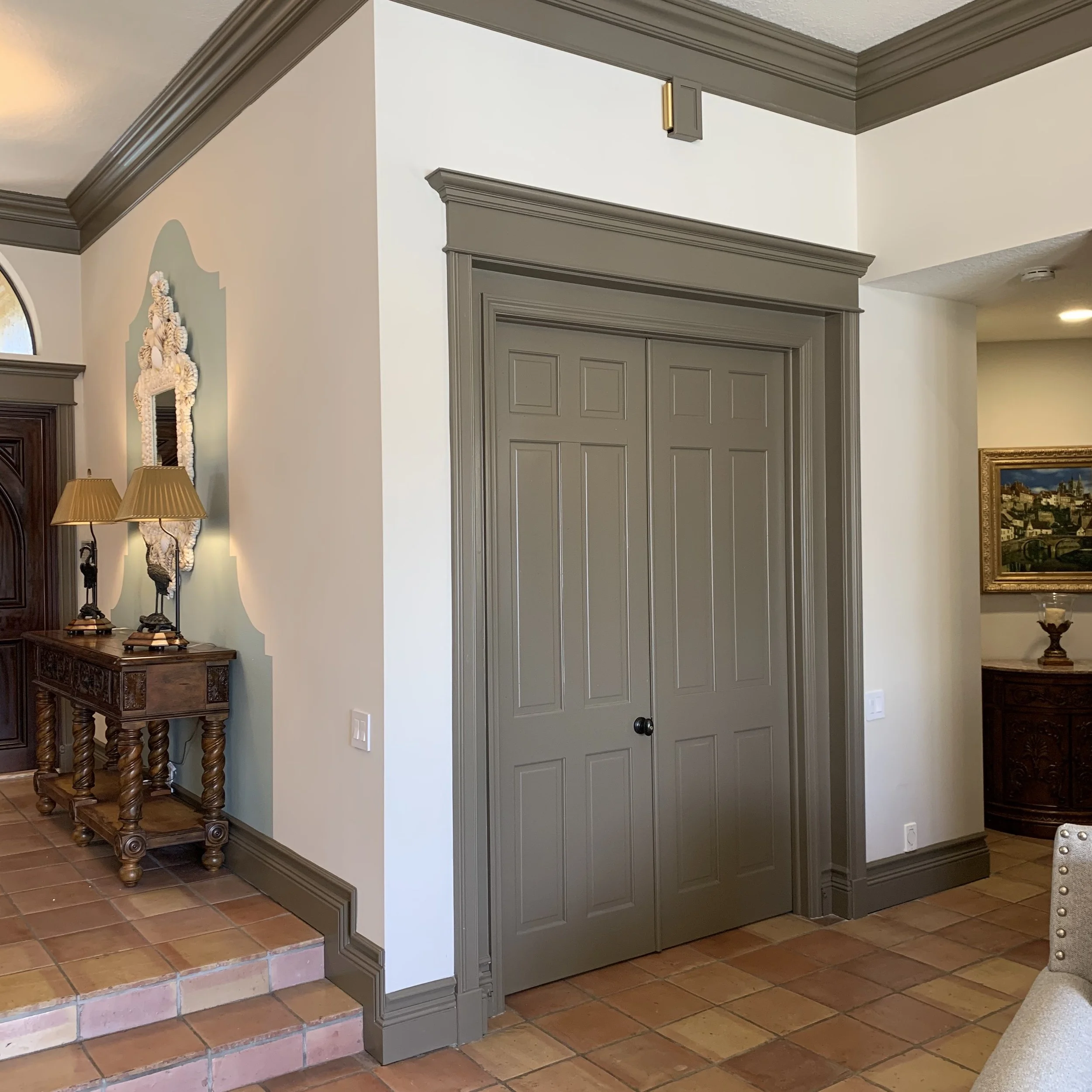 I took advantage of the niche where the garage and office doors were set to further emphasize the room's architectural scale. I designed door frames with crown molding and added a header to enhance their presence. This detail was repeated at every door, ensuring consistency and cohesion throughout the room.