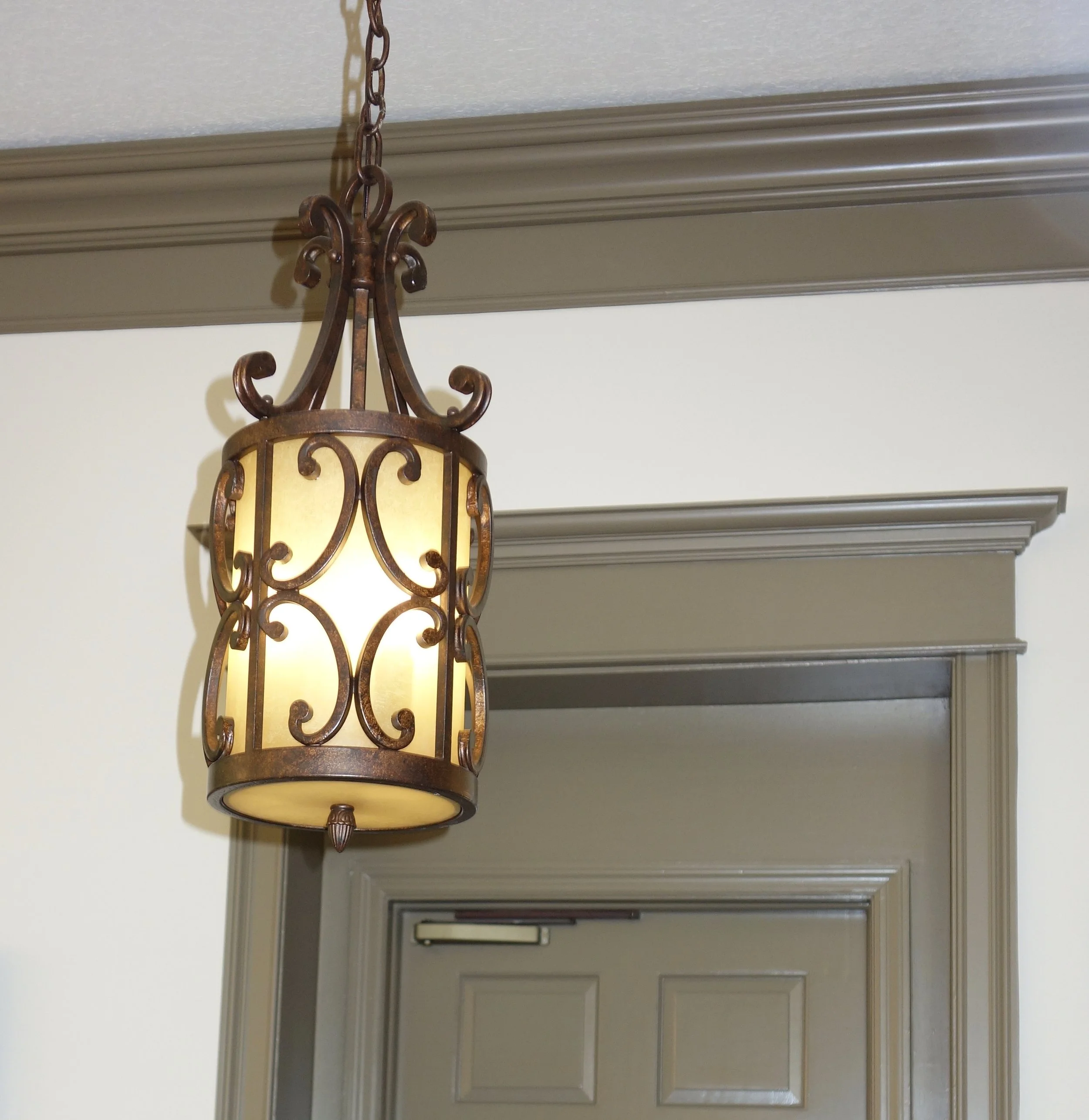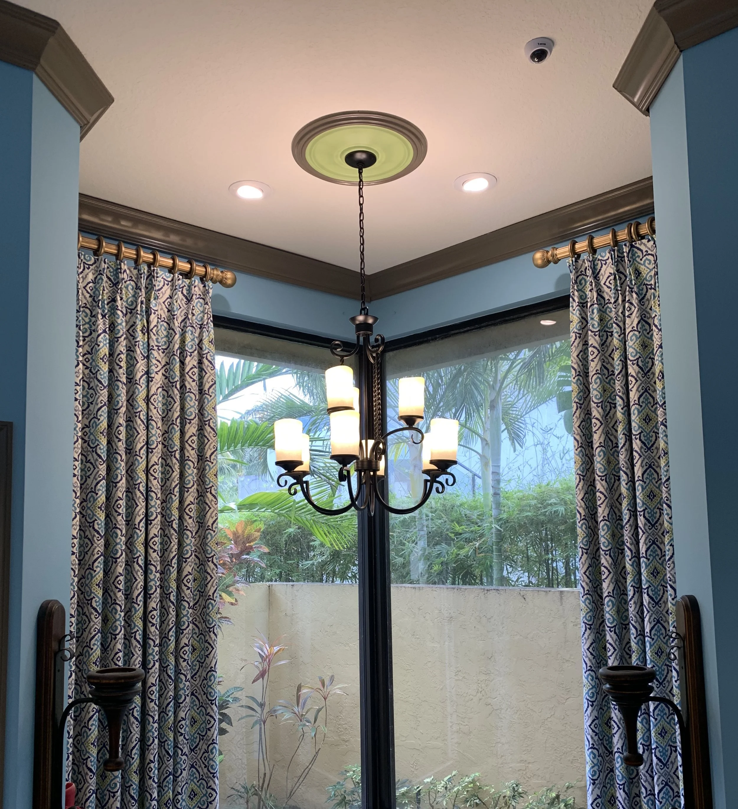 The existing dining room chandelier was relocated to the new piano room. In its place, I selected a grand Mediterranean-style wrought iron light fixture paired with tall matching sconces to frame the client's artwork. A tall matching chandelier was installed in the family room, centered over the fireplace, creating a focal point. The kitchen island is now illuminated by five Mediterranean wrought-iron pendants, bringing cohesion to the overall design.